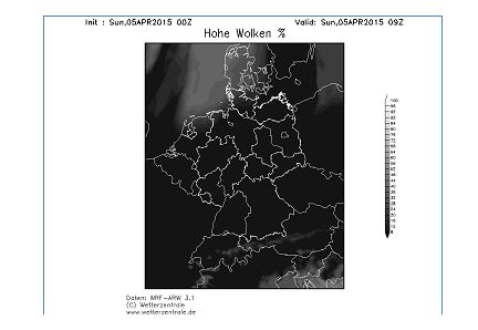 Abbildung 1 – Vorhersage der hohen Wolken läßt ungehinderte Einstrahlung erwarten. (Copyright: www.wetterzentrale.de)